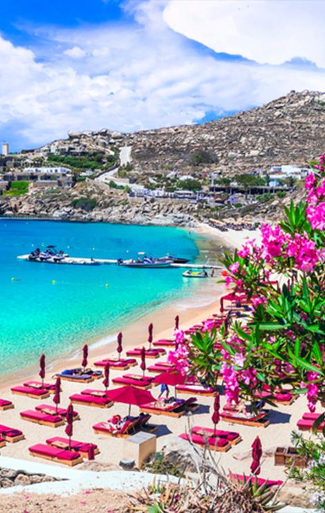 Un ruolo di primo piano a Mykonos viene rivestito dalle spiagge. A pochi passi dalla città di Chora, sorge Megali Ammos con le sue taverne all'insegna di prelibati piatti di pesce. Psarou Beach si contraddistingue per i famosi party sulla sabbia e un mare trasparente. Platis Gialos presenta numerosi alberghi ed è abbastanza tranquilla, mentre Paranga Beach è apprezzata da tutti gli amanti della natura incontaminata.